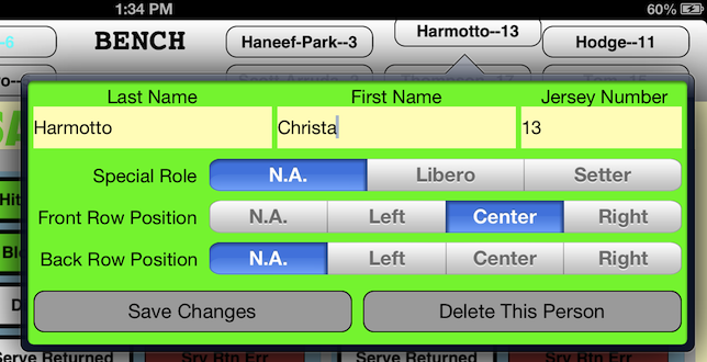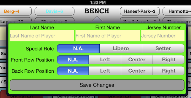 - Tap the Save Changes button. This will dismiss the popup window and add a button for the new player to the bench area. Tapping anywhere outside the player information window will dimmiss that window without recording any of the information.