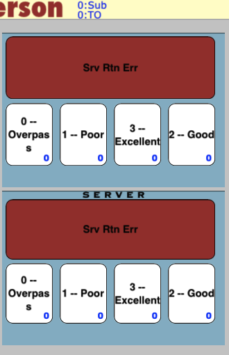 Game Play screen is used for recording stats. It is intentionally set up to look like one half of a volleyball court. The playing floor for the team for which you are recording stats (the green team) is represented by the large gray rectangle in the center of the screen. By default, on that grey background are six blue rectangles; one for each playing position. These blue rectangles contain a set of buttons to record stats for the person playing in that position. To help identify the positions, the words