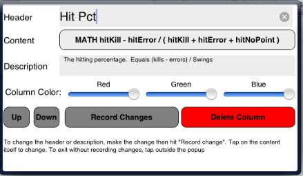 Detail Statistics section, buttons with thick borders have an additional behavior. They can always simply be tapped to record a statistic. But, if you long tap (i.e., tap and and hold for a second) a popup screen will appear that allows recording more details about that statistic. For instance, a long tap on the